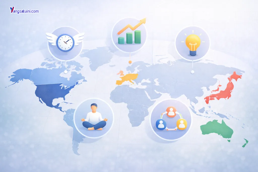 Meski konteks tiap negara berbeda, sebagian prinsip efektivitas kerja ini tetap bisa diterapkan secara personal melalui kebiasaan kerja sehari-hari. 🔗 5 Cara Meningkatkan Efektivitas Waktu Kerja Tanpa Menambah Jam Kerja